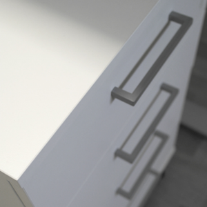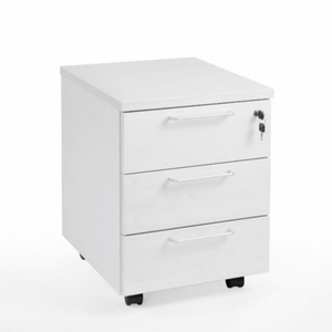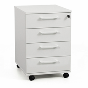Valkoinen kolmen tai neljän laatikon laatikosto lukituksella (kaksi avainta) ja pyörillä. Metallinharmaat vetimet. Lukittavat etupyörät.